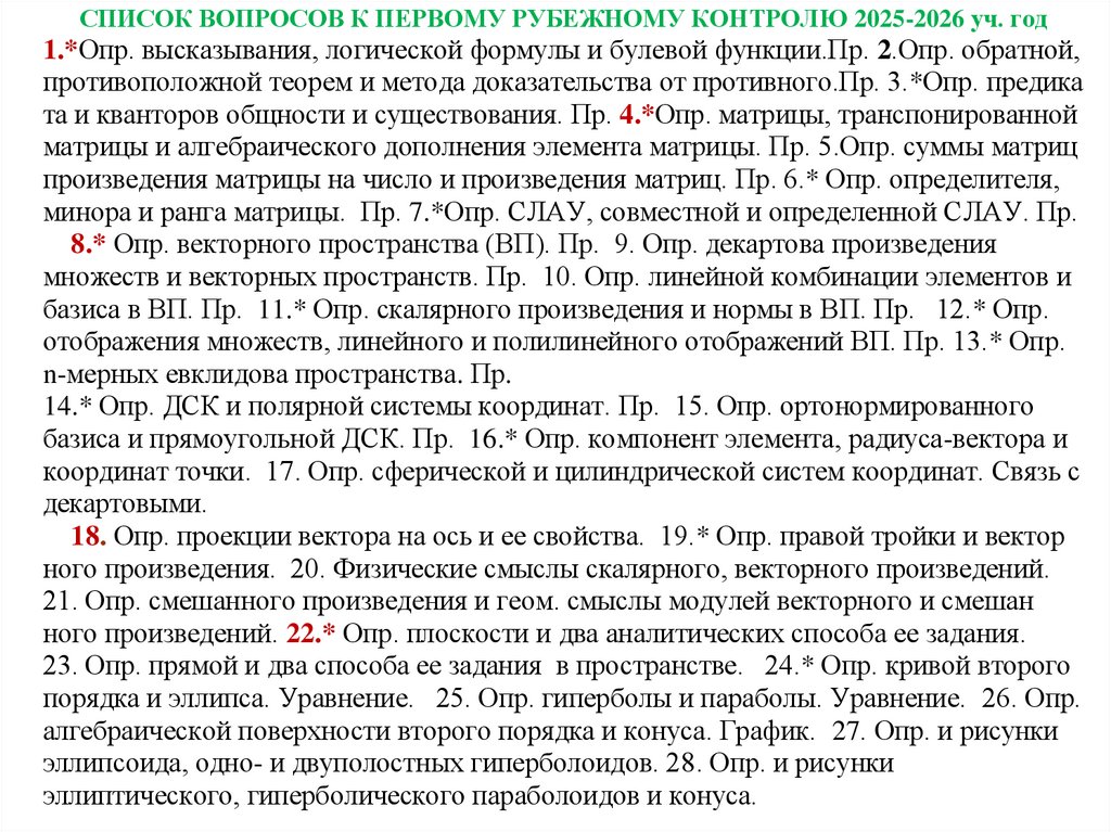 СПИСОК ВОПРОСОВ К ПЕРВОМУ РУБЕЖНОМУ КОНТРОЛЮ 2025-2026 уч. год1.*Опр. высказывания, логической формулы и булевой функции.Пр. 2.Опр. обратной,