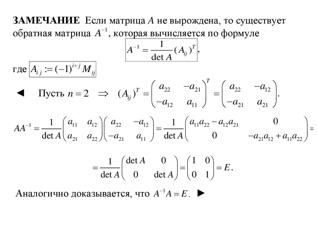 Обратная к квадратной матрице A (ai j ) размера n n квадратная матрица A 1 (bi j ) размера n n со свойством