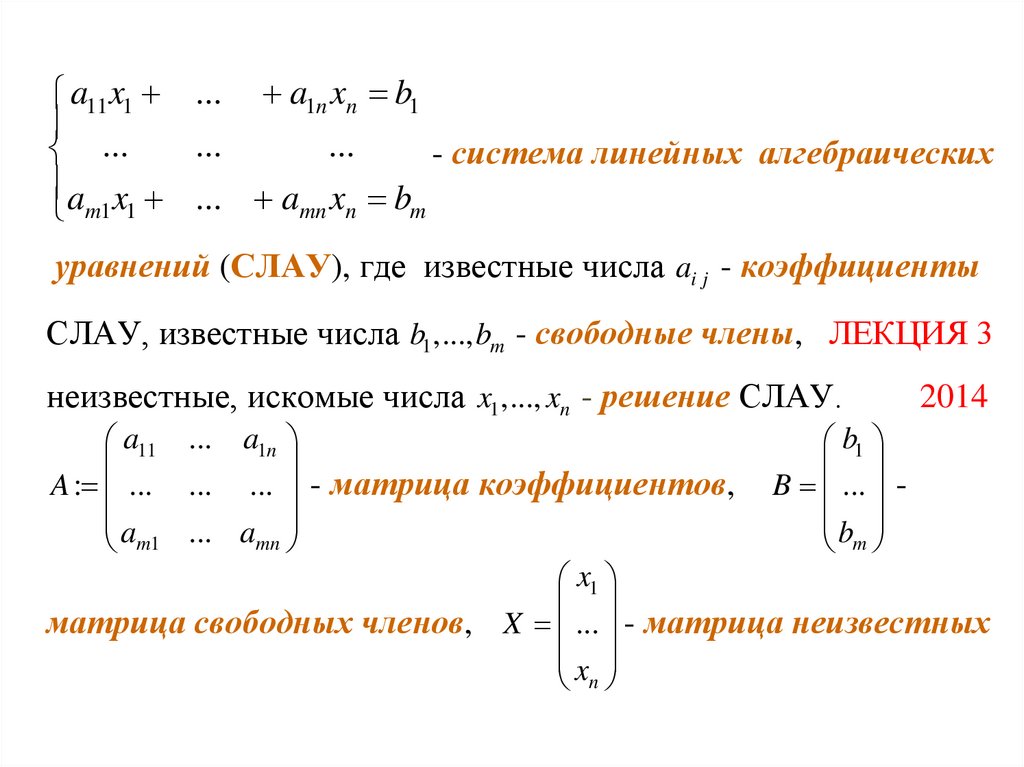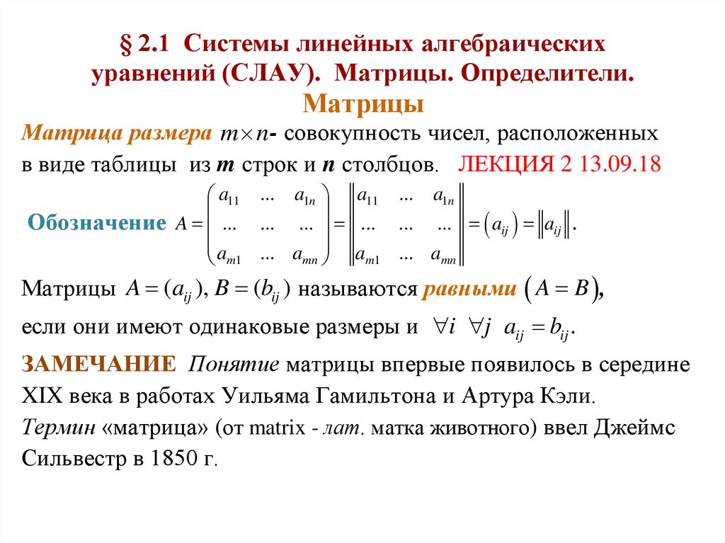 § 2.1 Системы линейных алгебраическихуравнений (СЛАУ). Матрицы. Определители.