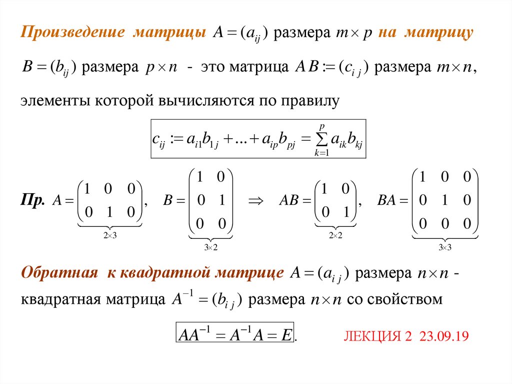 Произведение матрицы A (aij ) размера m p на матрицуB (bij ) размера p n - это матрица A B : (ci j ) размера m n ,