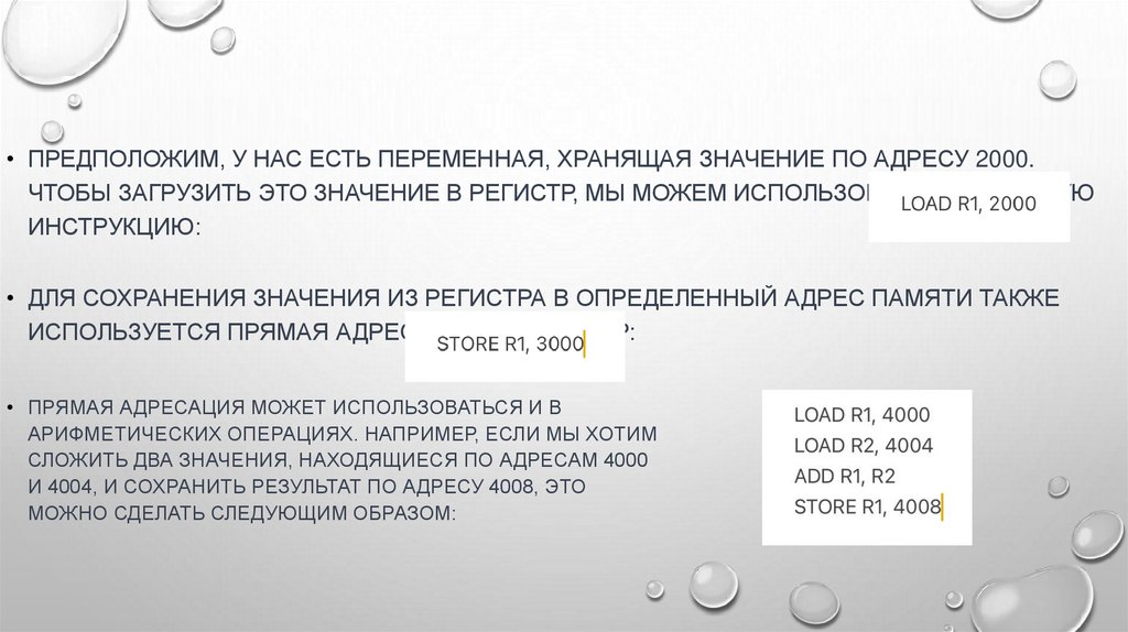 • ПРЕДПОЛОЖИМ, У НАС ЕСТЬ ПЕРЕМЕННАЯ, ХРАНЯЩАЯ ЗНАЧЕНИЕ ПО АДРЕСУ 2000.ЧТОБЫ ЗАГРУЗИТЬ ЭТО ЗНАЧЕНИЕ В РЕГИСТР, МЫ МОЖЕМ ИСПОЛЬЗОВАТЬ СЛЕДУЮЩУЮ