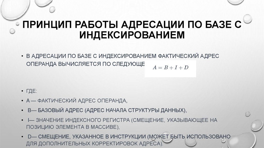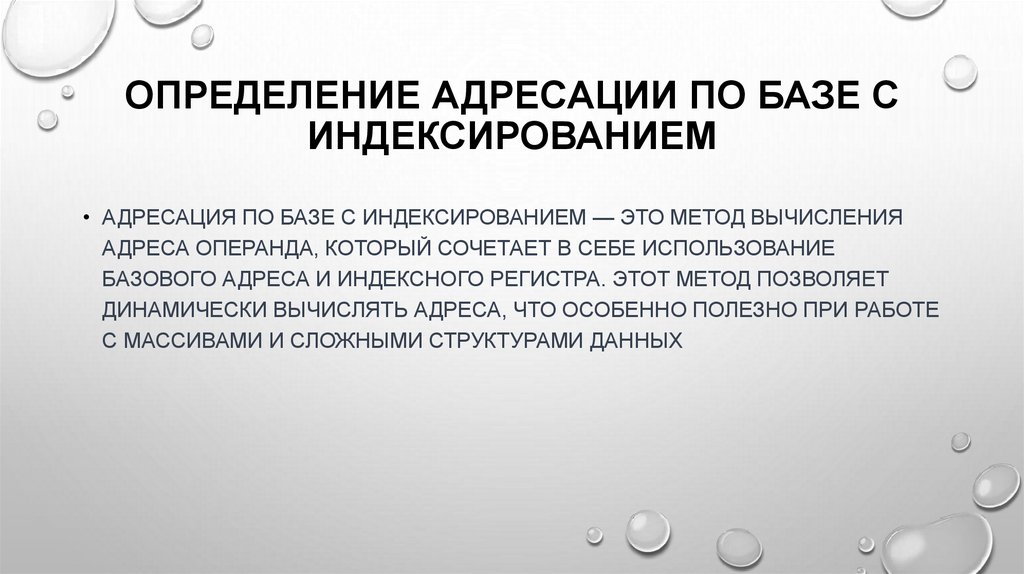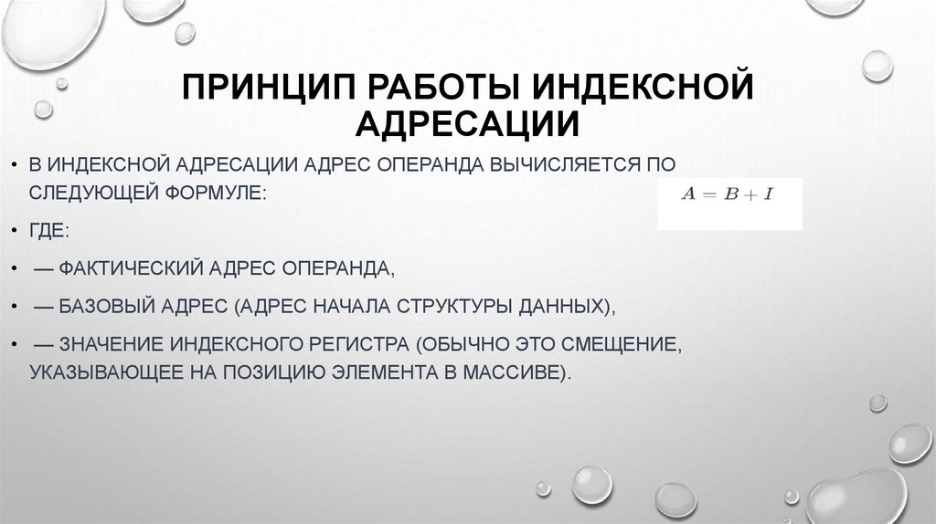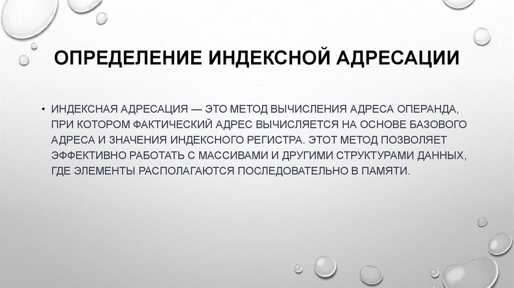 ОПРЕДЕЛЕНИЕ ИНДЕКСНОЙ АДРЕСАЦИИ• ИНДЕКСНАЯ АДРЕСАЦИЯ — ЭТО МЕТОД ВЫЧИСЛЕНИЯ АДРЕСА ОПЕРАНДА,