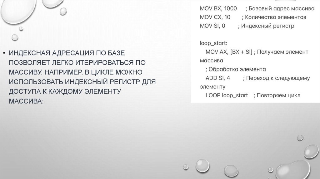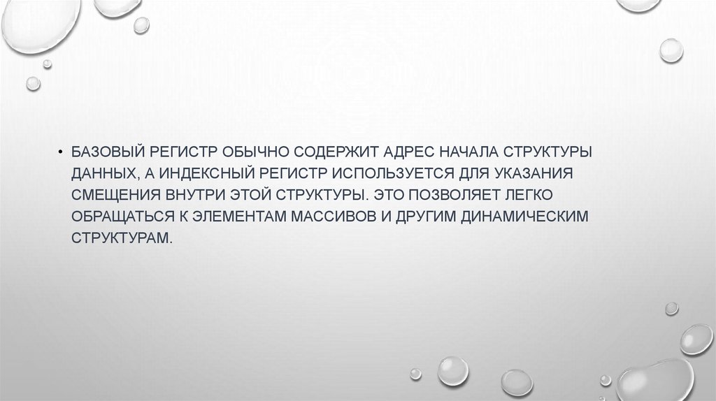 • БАЗОВЫЙ РЕГИСТР ОБЫЧНО СОДЕРЖИТ АДРЕС НАЧАЛА СТРУКТУРЫДАННЫХ, А ИНДЕКСНЫЙ РЕГИСТР ИСПОЛЬЗУЕТСЯ ДЛЯ УКАЗАНИЯ