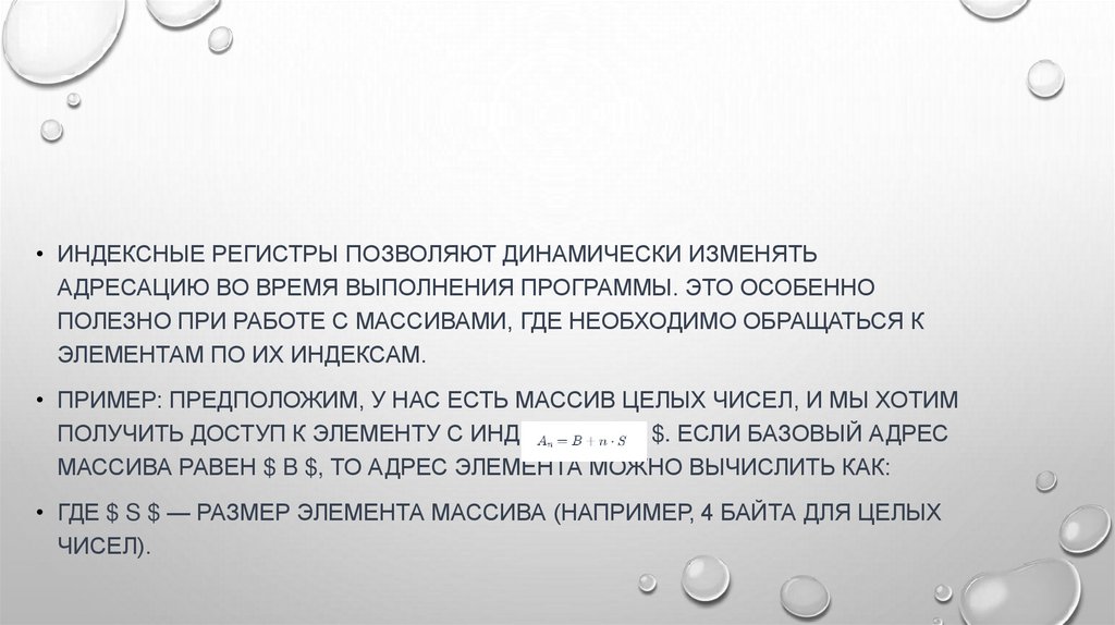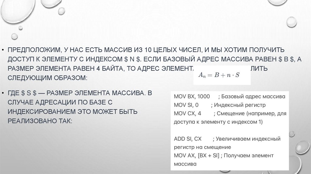 • ПРЕДПОЛОЖИМ, У НАС ЕСТЬ МАССИВ ИЗ 10 ЦЕЛЫХ ЧИСЕЛ, И МЫ ХОТИМ ПОЛУЧИТЬДОСТУП К ЭЛЕМЕНТУ С ИНДЕКСОМ $ N $. ЕСЛИ БАЗОВЫЙ АДРЕС МАССИВА РАВЕН $ B $, А