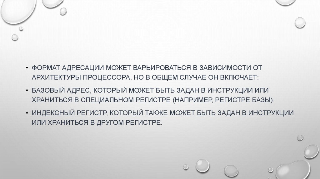 • ФОРМАТ АДРЕСАЦИИ МОЖЕТ ВАРЬИРОВАТЬСЯ В ЗАВИСИМОСТИ ОТАРХИТЕКТУРЫ ПРОЦЕССОРА, НО В ОБЩЕМ СЛУЧАЕ ОН ВКЛЮЧАЕТ: