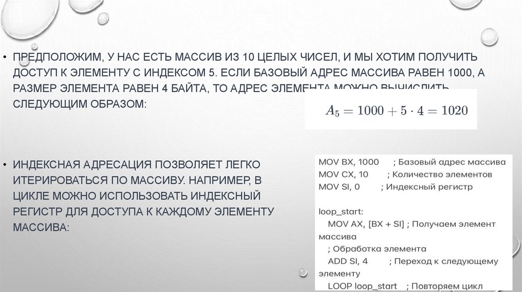• ПРЕДПОЛОЖИМ, У НАС ЕСТЬ МАССИВ ИЗ 10 ЦЕЛЫХ ЧИСЕЛ, И МЫ ХОТИМ ПОЛУЧИТЬДОСТУП К ЭЛЕМЕНТУ С ИНДЕКСОМ 5. ЕСЛИ БАЗОВЫЙ АДРЕС МАССИВА РАВЕН 1000, А
