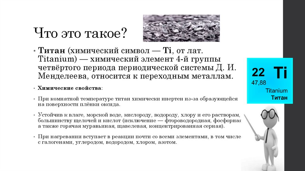 • Титан (химический символ — Ti, от лат.Titanium) — химический элемент 4-й группы