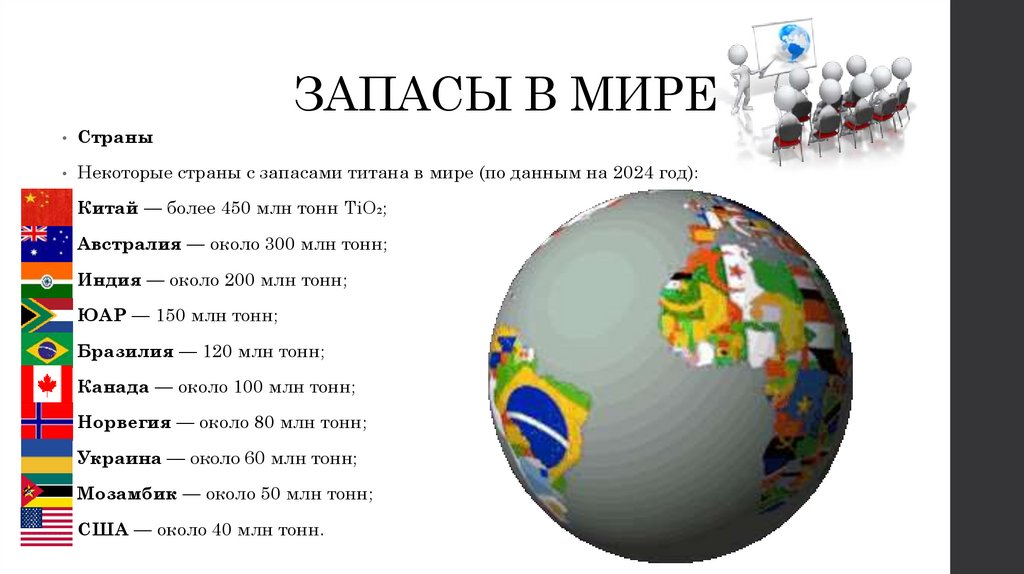 Некоторые страны с запасами титана в мире (по данным на 2024 год):
