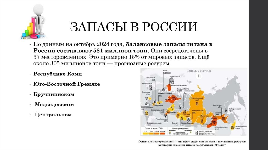 • По данным на октябрь 2024 года, балансовые запасы титана вРоссии составляют 581 миллион тонн. Они сосредоточены в