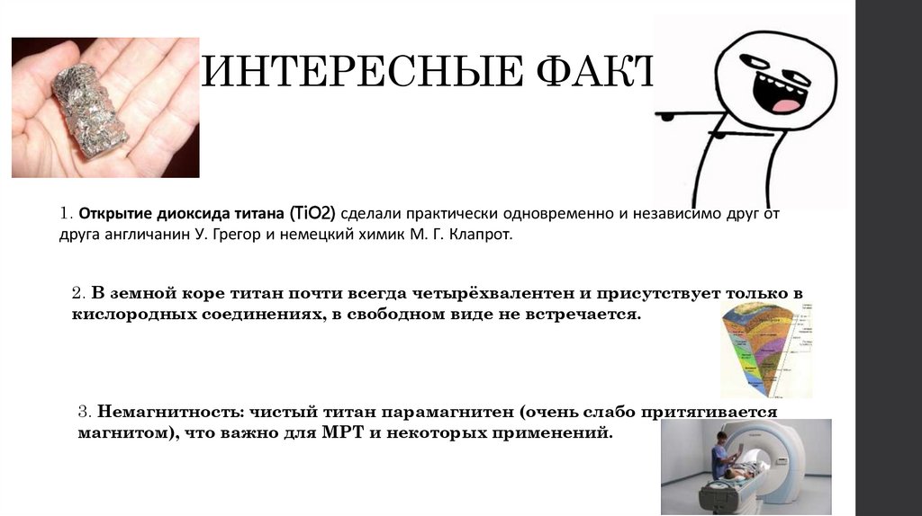 1. Открытие диоксида титана (TiO2) сделали практически одновременно и независимо друг отдруга англичанин У. Грегор и немецкий химик М. Г. Клапрот.