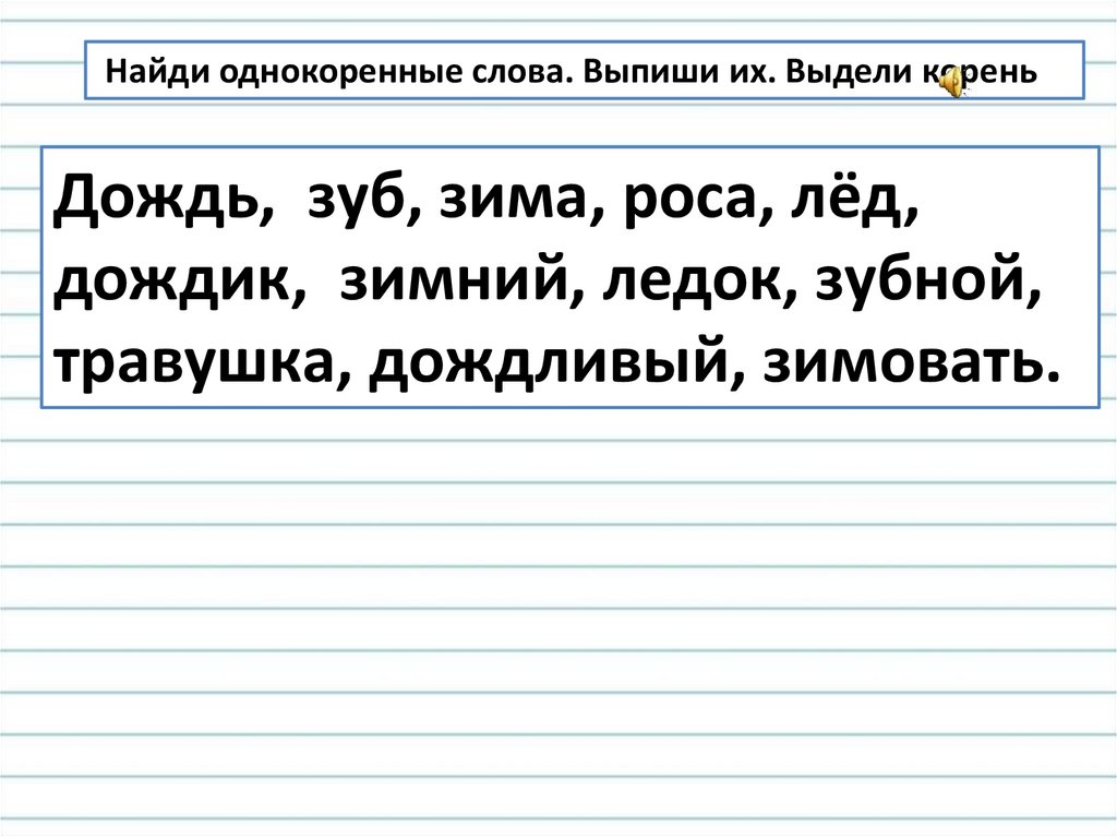 Найди однокоренные слова. Выпиши их. Выдели кореньДождь, зуб, зима, роса, лёд,