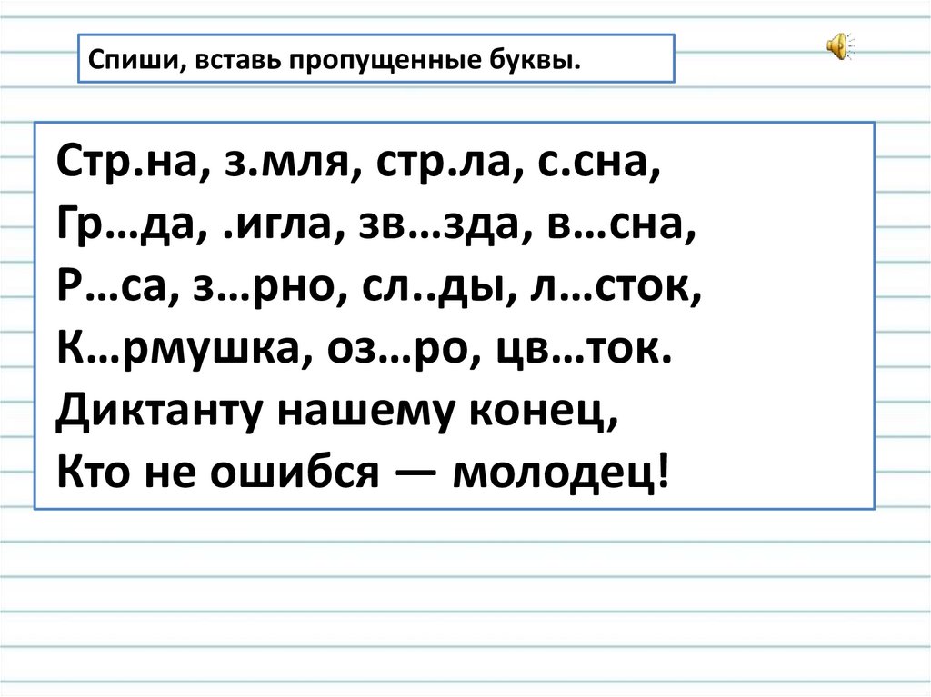 Спиши, вставь пропущенные буквы.Стр.на, з.мля, стр.ла, с.сна,