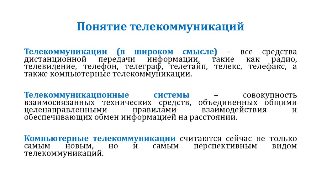 Телекоммуникации (в широком смысле) – все средствадистанционной передачи информации, такие как радио,