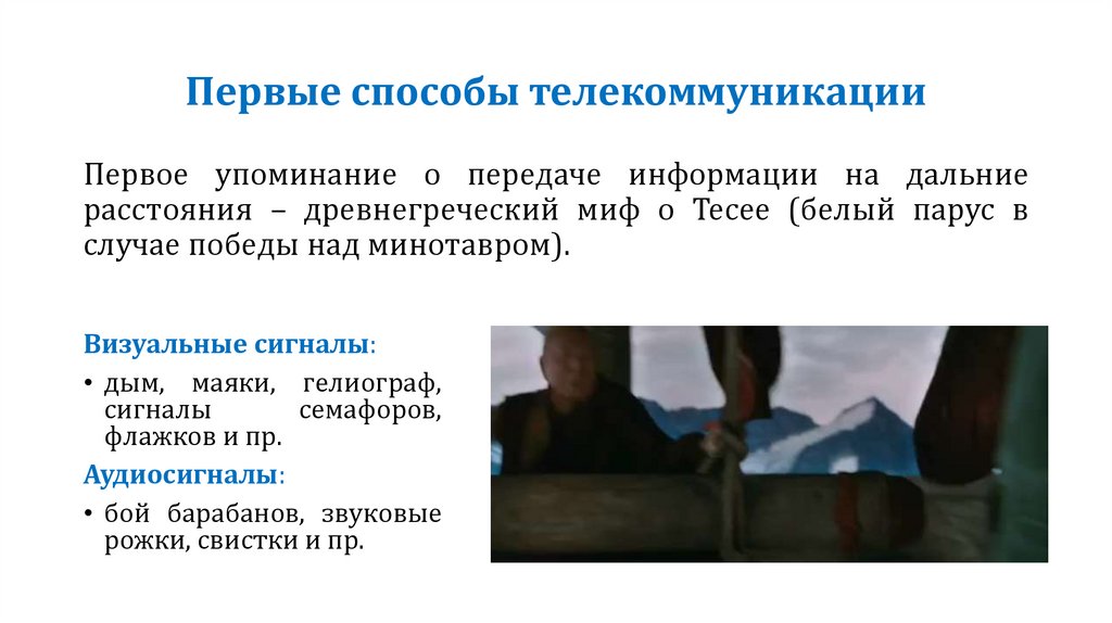Первое упоминание о передаче информации на дальниерасстояния – древнегреческий миф о Тесее (белый парус в