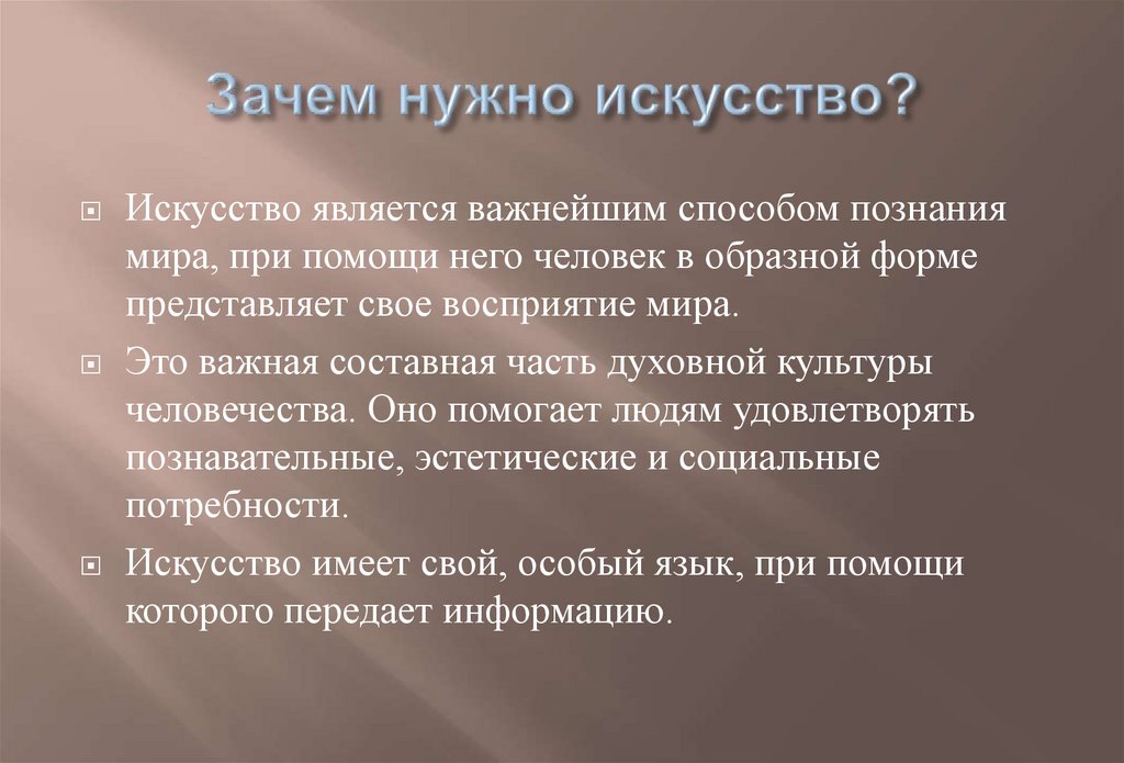 Искусство является важнейшим способом познаниямира, при помощи него человек в образной форме