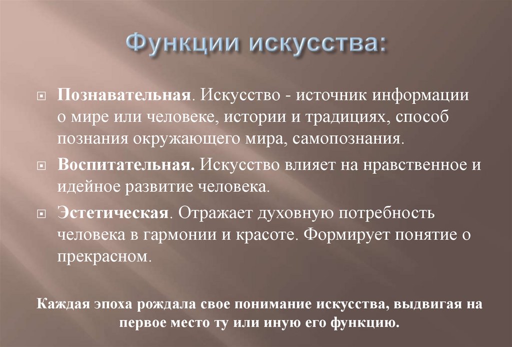 Познавательная. Искусство - источник информациио мире или человеке, истории и традициях, способ