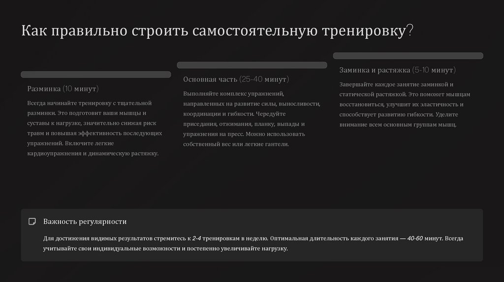 учитывайте свои индивидуальные возможности и постепенно увеличивайте нагрузку.