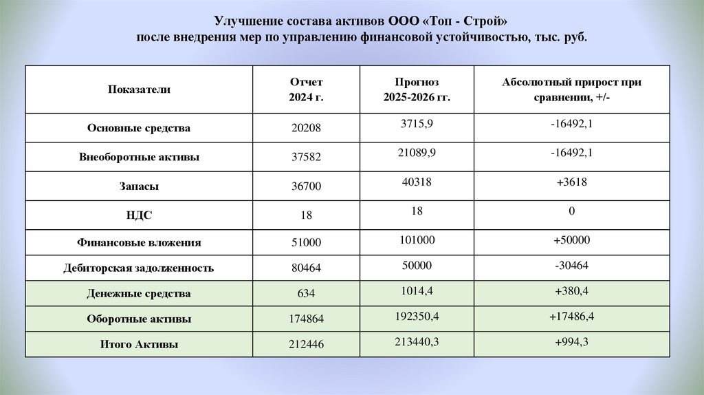 Улучшение состава активов ООО «Топ - Строй»после внедрения мер по управлению финансовой устойчивостью, тыс. руб.