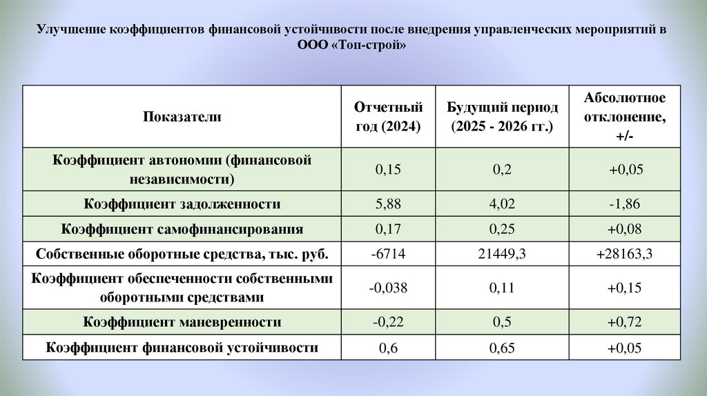 Улучшение коэффициентов финансовой устойчивости после внедрения управленческих мероприятий вООО «Топ-строй»