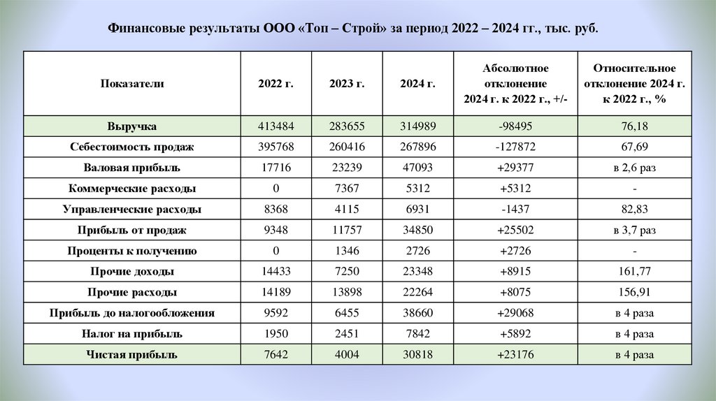 Финансовые результаты ООО «Топ – Строй» за период 2022 – 2024 гг., тыс. руб.Показатели