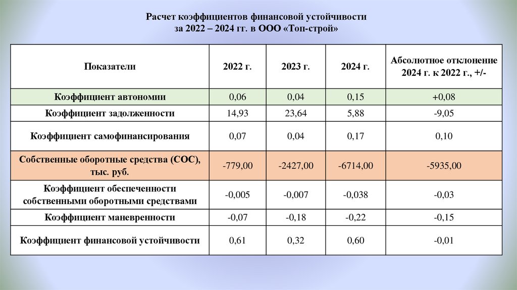 расчет и оценка коэффициентов финансовой устойчивости в ООО «Топ - Строй»;