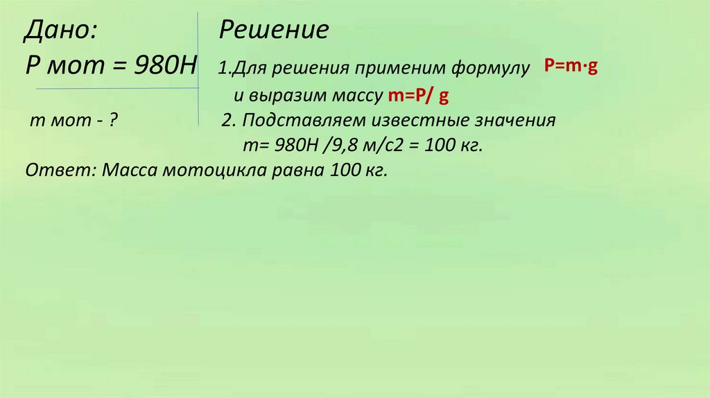 Р мот = 980Н 1.Для решения применим формулу P=m⋅g