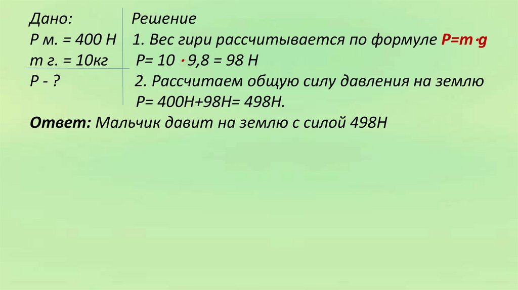 Р м. = 400 Н 1. Вес гири рассчитывается по формуле P=m⋅g
