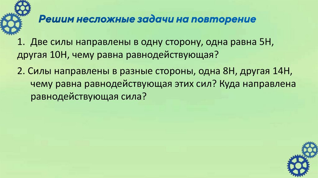 1. Две силы направлены в одну сторону, одна равна 5Н,другая 10Н, чему равна равнодействующая?
