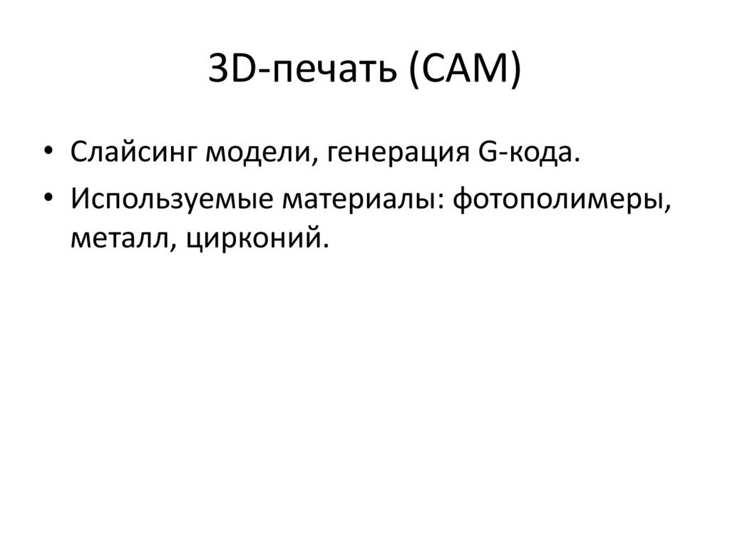 3D-печать (CAM)• Слайсинг модели, генерация G-кода.