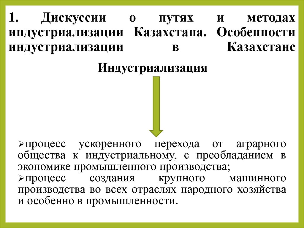 1. Дискуссии о путях и методах индустриализацииКазахстана. Особенности индустриализации в Казахстане;