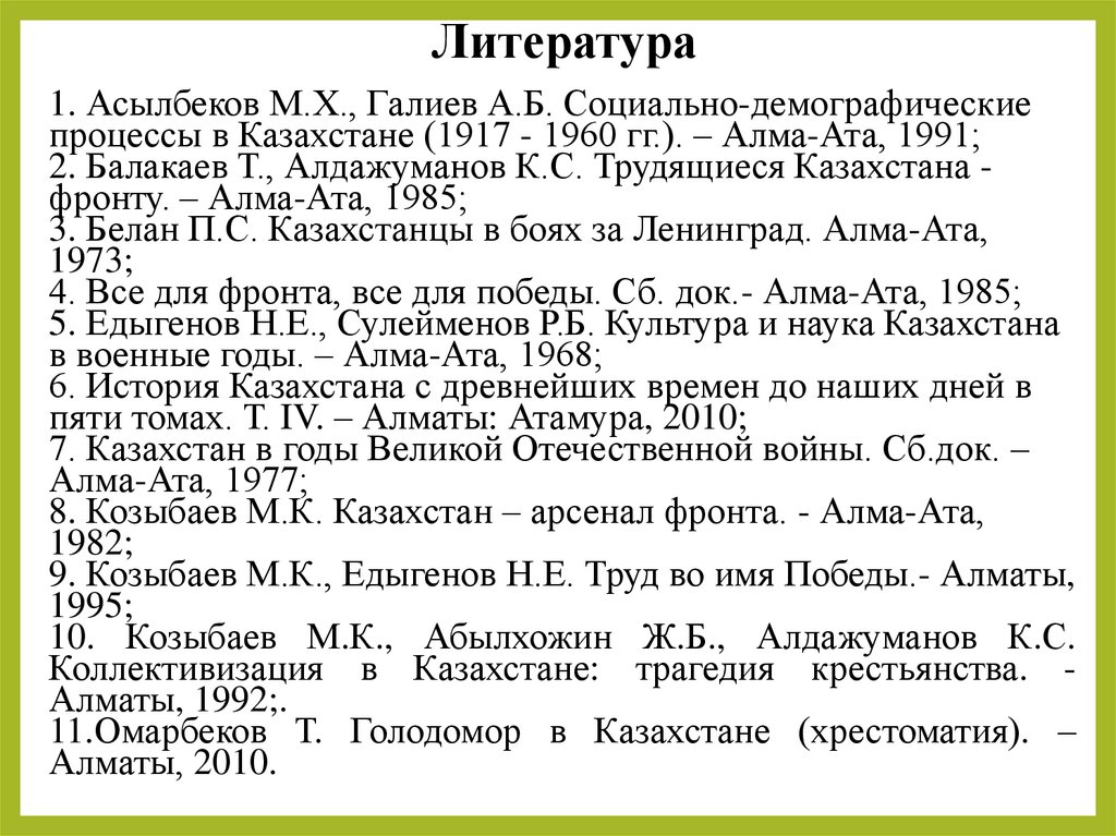 2. Балакаев Т., Алдажуманов К.С. Трудящиеся Казахстана фронту. – Алма-Ата, 1985;