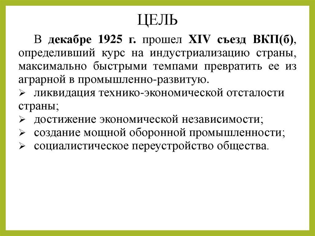 В декабре 1925 г. прошел XIV съезд ВКП(б),определивший курс на индустриализацию страны,