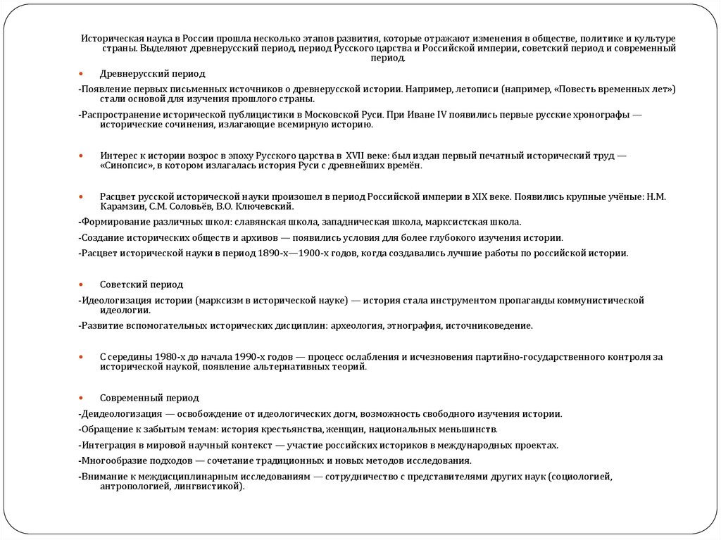 Историческая наука в России прошла несколько этапов развития, которые отражают изменения в обществе, политике и культурестраны. Выделяют древнерусский период, период Русского царства и Российской империи, советский период и современный