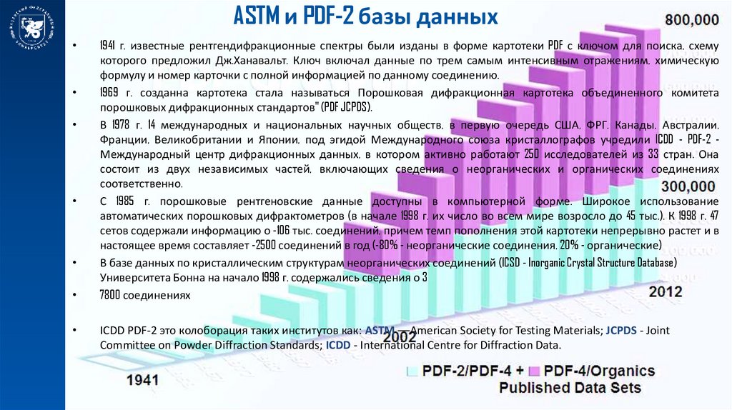 Франции, Великобритании и Японии, под эгидой Международного союза кристаллографов учредили ICDD - PDF-2 Международный центр дифракционных данных, в котором активно работают 250 исследователей из 33 стран. Она