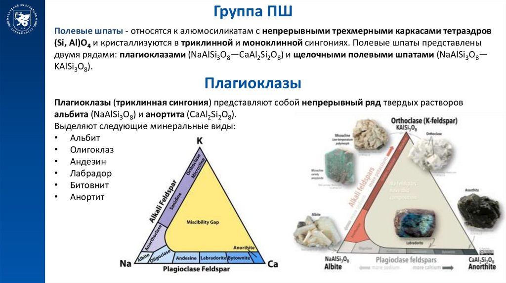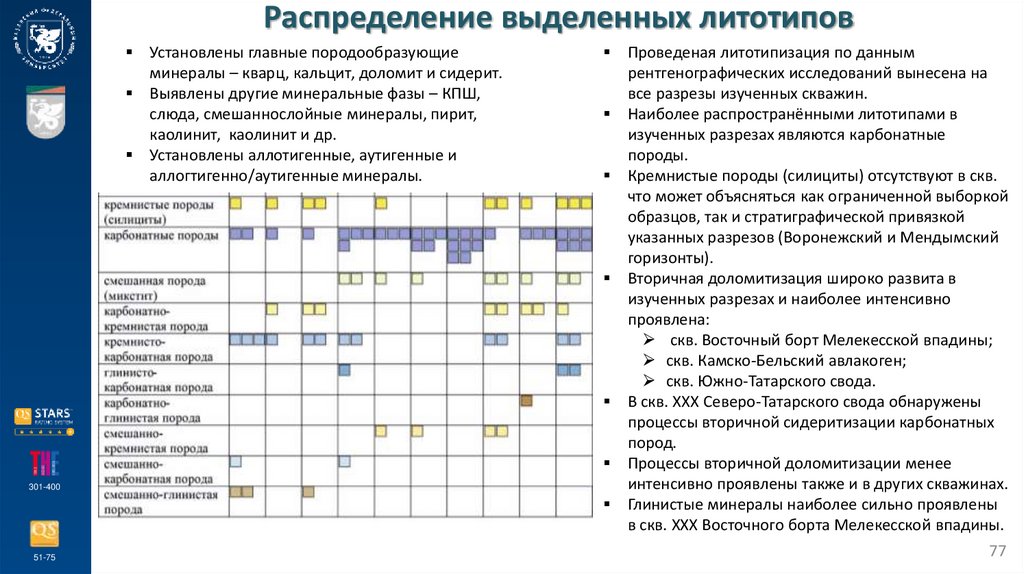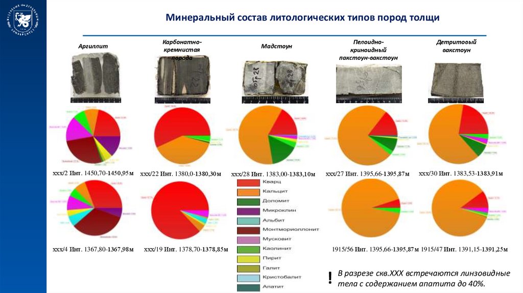 кальцит (от 8 до 48%) и калиево-полевой шпат (от 8 до 28%). Практически повсеместно