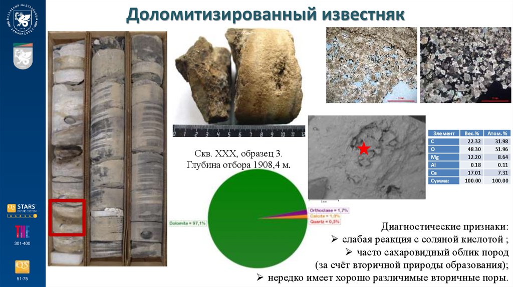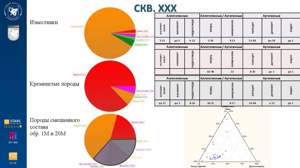 в качестве второстепенного минерала выступают доломит (1-24%), слюда (8-21%) и