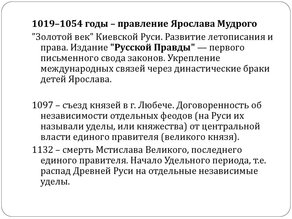 1019–1054 годы – правление Ярослава Мудрого"Золотой век" Киевской Руси. Развитие летописания и