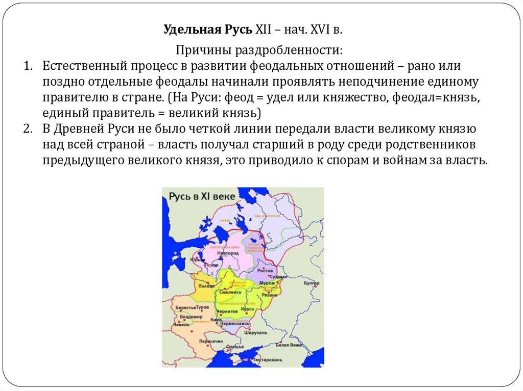 Удельная Русь XII – нач. XVI в.Причины раздробленности: