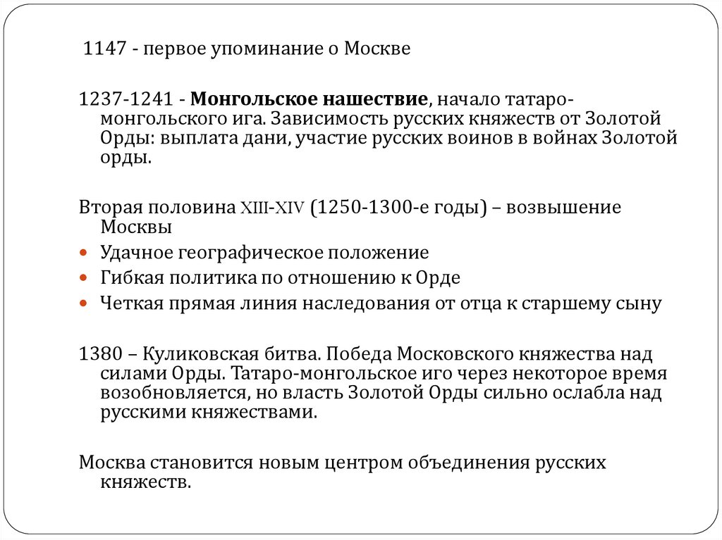 1147 - первое упоминание о Москве1237-1241 - Монгольское нашествие, начало татаромонгольского ига. Зависимость русских княжеств от Золотой