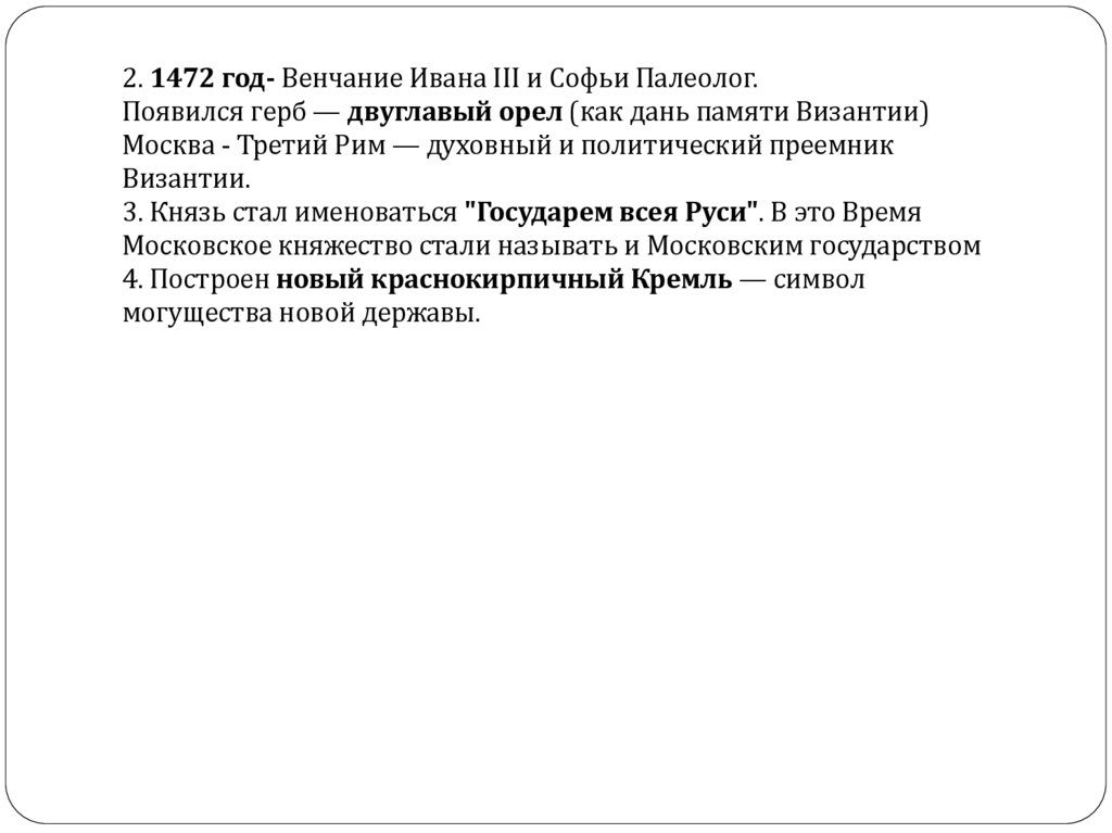 2. 1472 год- Венчание Ивана III и Софьи Палеолог.Появился герб — двуглавый орел (как дань памяти Византии)