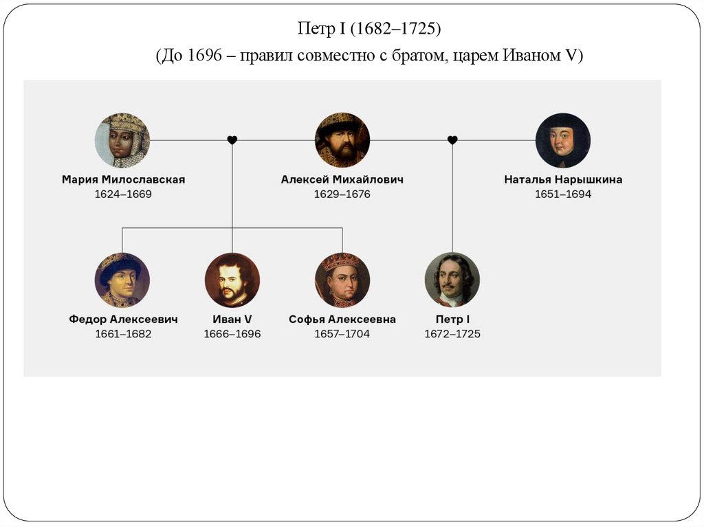 Петр I (1682–1725)(До 1696 – правил совместно с братом, царем Иваном V)