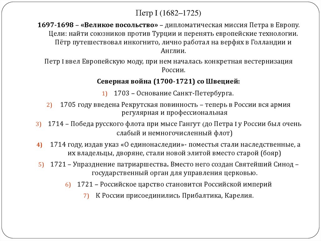 Петр I (1682–1725)1697-1698 – «Великое посольство» – дипломатическая миссия Петра в Европу.