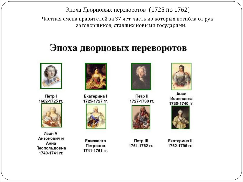 Эпоха Дворцовых переворотов (1725 по 1762)Частная смена правителей за 37 лет, часть из которых погибла от рук