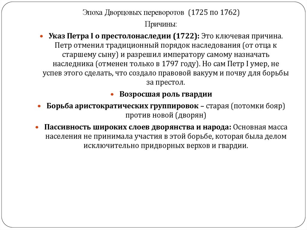 Эпоха Дворцовых переворотов (1725 по 1762)Причины: