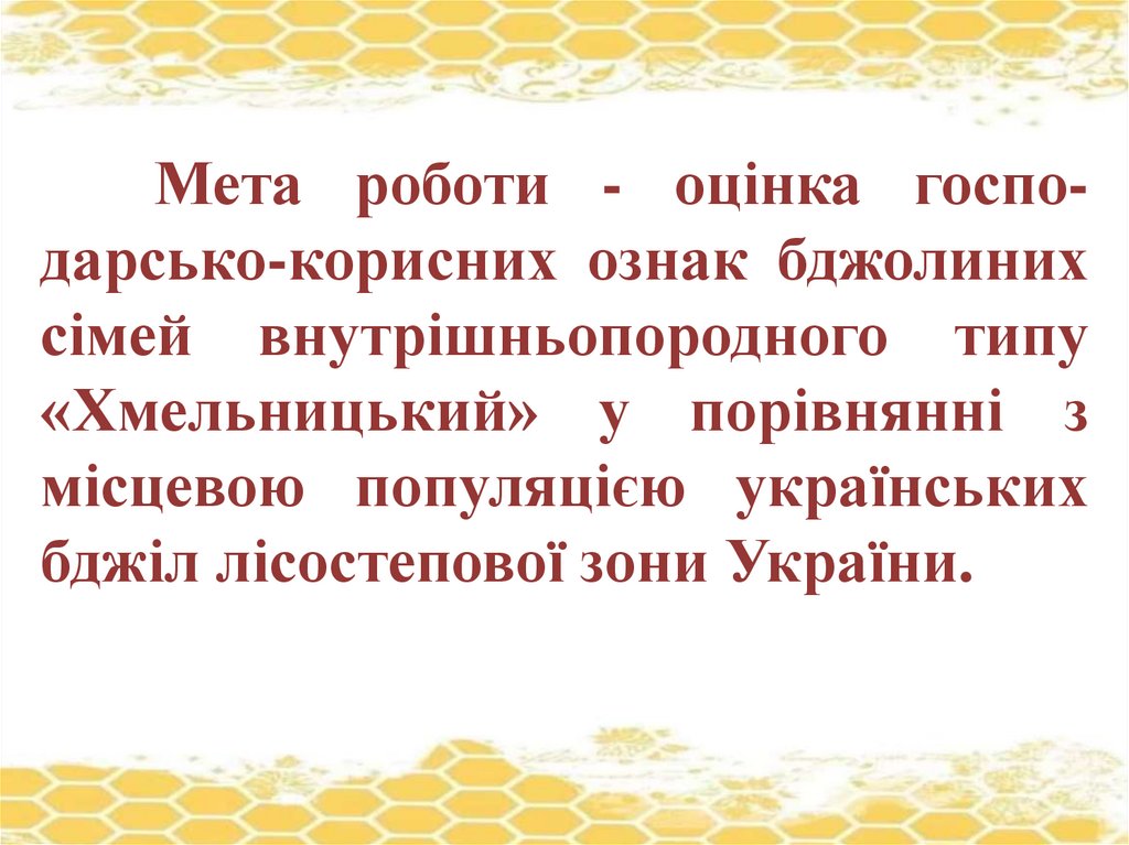 Мета роботи - оцінка господарсько-корисних ознак бджолинихсімей внутрішньопородного типу