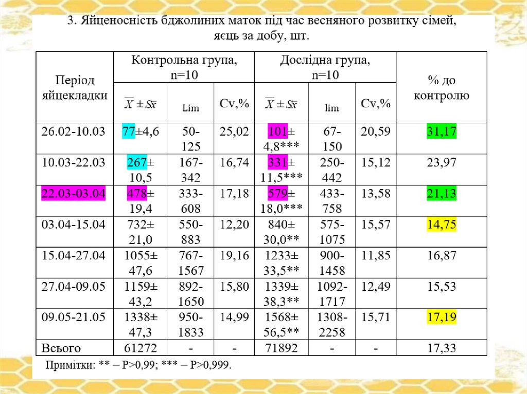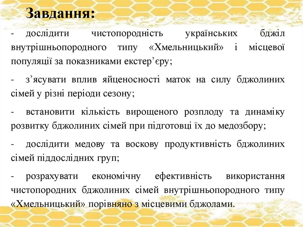 - дослідити медову та воскову продуктивність бджолиних
