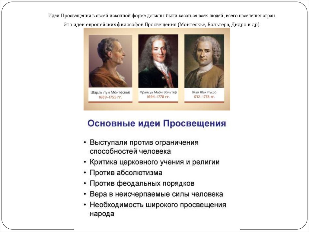 Идеи Просвещения в своей исконной форме должны были касаться всех людей, всего населения стран.Это идеи европейских философов Просвещения (Монтескьё, Вольтера, Дидро и др).