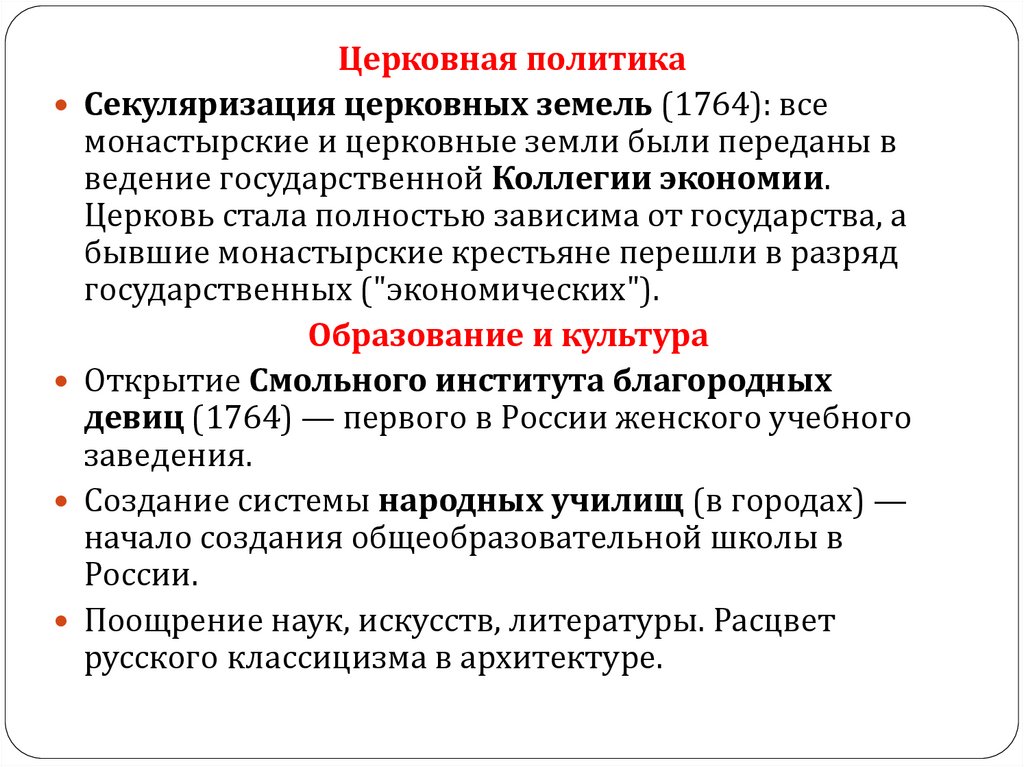 Церковная политикаСекуляризация церковных земель (1764): все