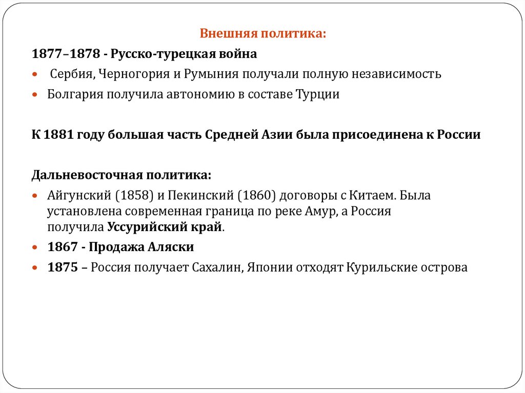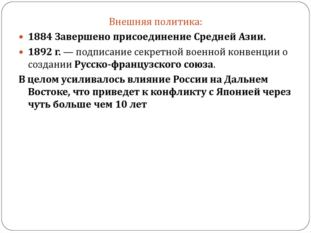 Внешняя политика:1884 Завершено присоединение Средней Азии.