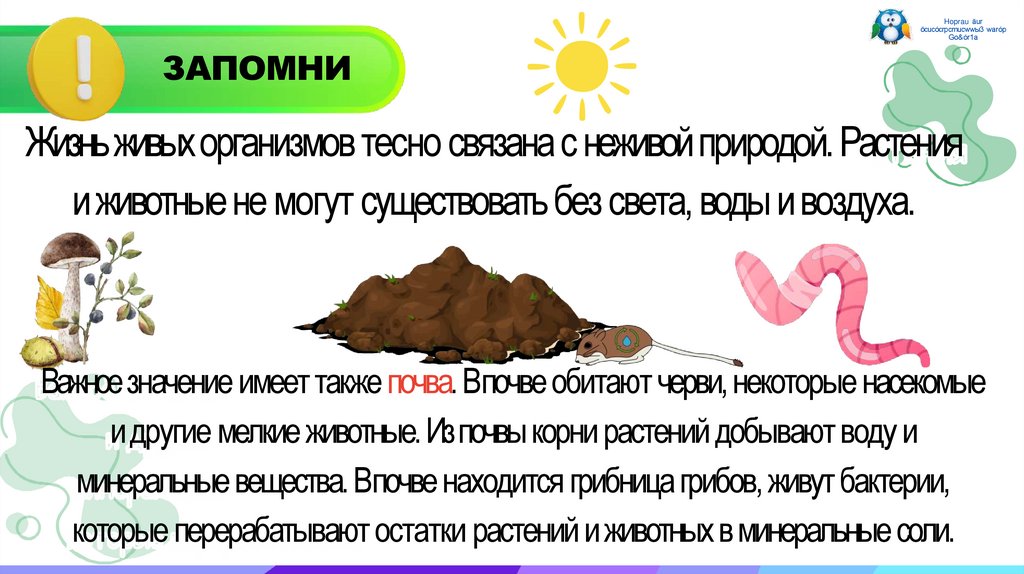 минеральные вещества. Впочве находится грибница грибов, живут бактерии,